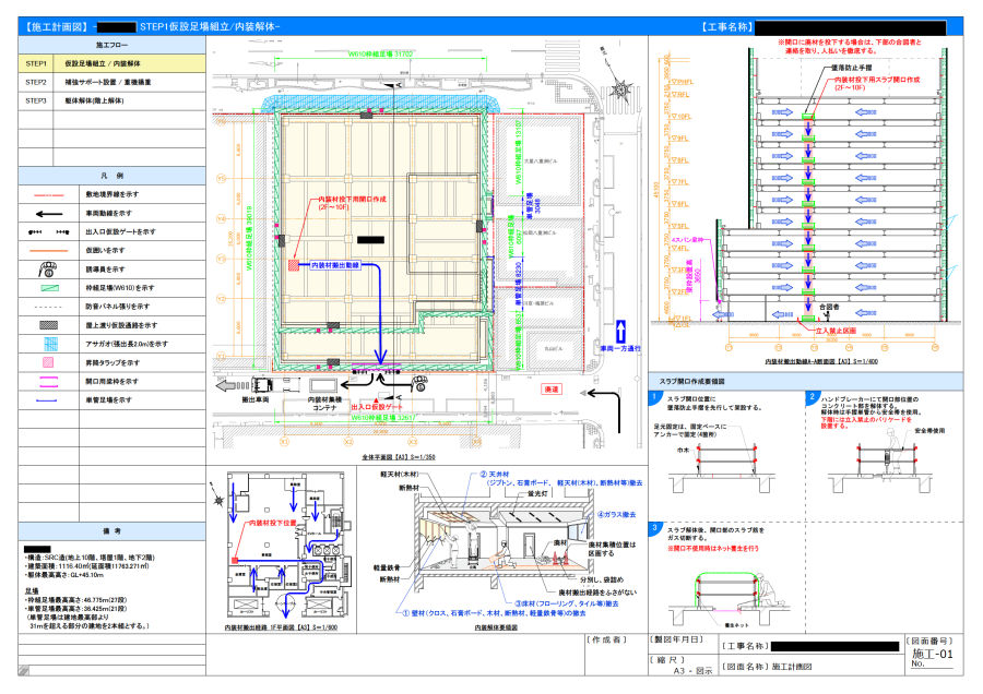 解体工事の順序を明確にする「施工ステップ図」と搬出入ゲート、詰所、足場などの配置を反映した「総合仮設図」の2種類の施工計画図を、AUTOCADを用いて作成いたします。
